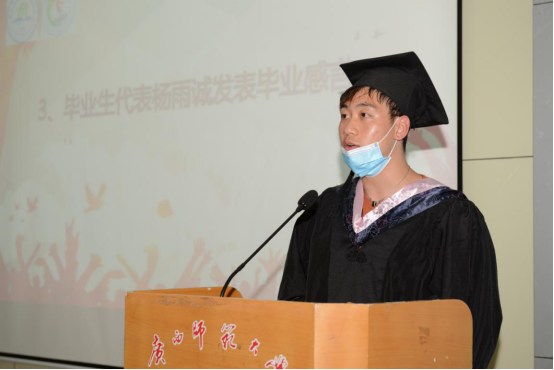 漓江学院体育与健康学院2020届毕业生杨雨诚、健康休闲教研室主任邱晓玲老师分别作为毕业生代表和教师代表发表了对毕业班同学的感言。