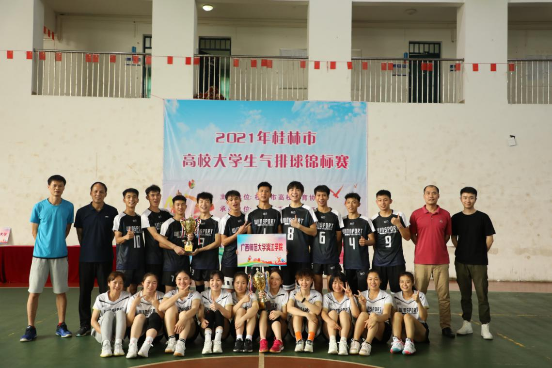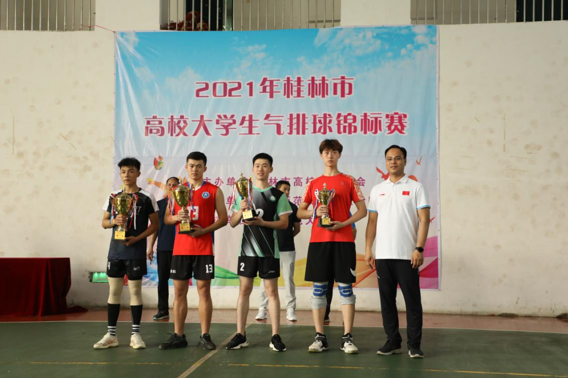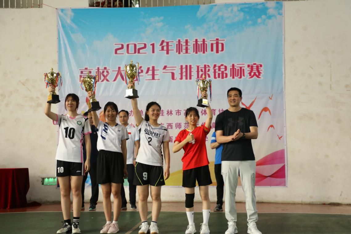 5月8日下午,由桂林市高校体育协会主办,广西师范大学漓江学院承办的“2021年桂林市高校大学生气排球锦标赛”在我校彰善楼室内活动中心隆重举行,出席闭幕式颁奖的嘉宾有:桂林市高校体育协会会长、桂林理工大学体育部主任—魏建军;广西师范大学漓江学院党委副书记、纪委书记、副校长邓志平;广西师范大学漓江学院体育与健康学院院长李善华。