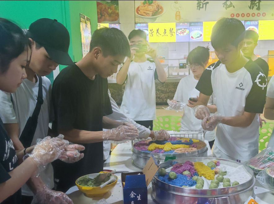 活动当天,参加活动的人员在乐善食府二楼集合,由壮族学生代表向各分组成员介绍“三月三”节日的由来和相关的民俗。随后,同学们纷纷开始学习壮族美食“五色糯米”和“青糍粑”的制作,等到糯米饭和糍粑蒸熟以后,同学们分工明确,对糯米饭进行了摆盘装饰,亲口尝试了自制美食。