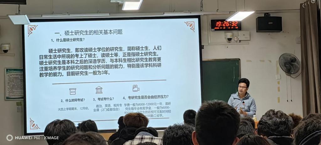 活动中,主讲人从“为什么要考研”、“怎样去了解考研相关信息”和“选择你的考研目标”等几个方面问题,进而激发同学们的考研热情,鼓励同学们在入校时树立考研意识、树立明确的学业目标。主讲老师们与同学们分享了自身的考研经验,并鼓励同学们尽快确定目标,努力学习,脚踏实地地走好大学每一步。