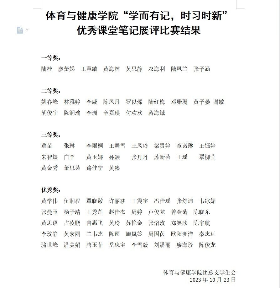 11月份,体育与健康学院面向各年级开展了“学而有记,时习时新”优秀课堂笔记展评活动,该活动由体育与健康学院团总支学生会承办。