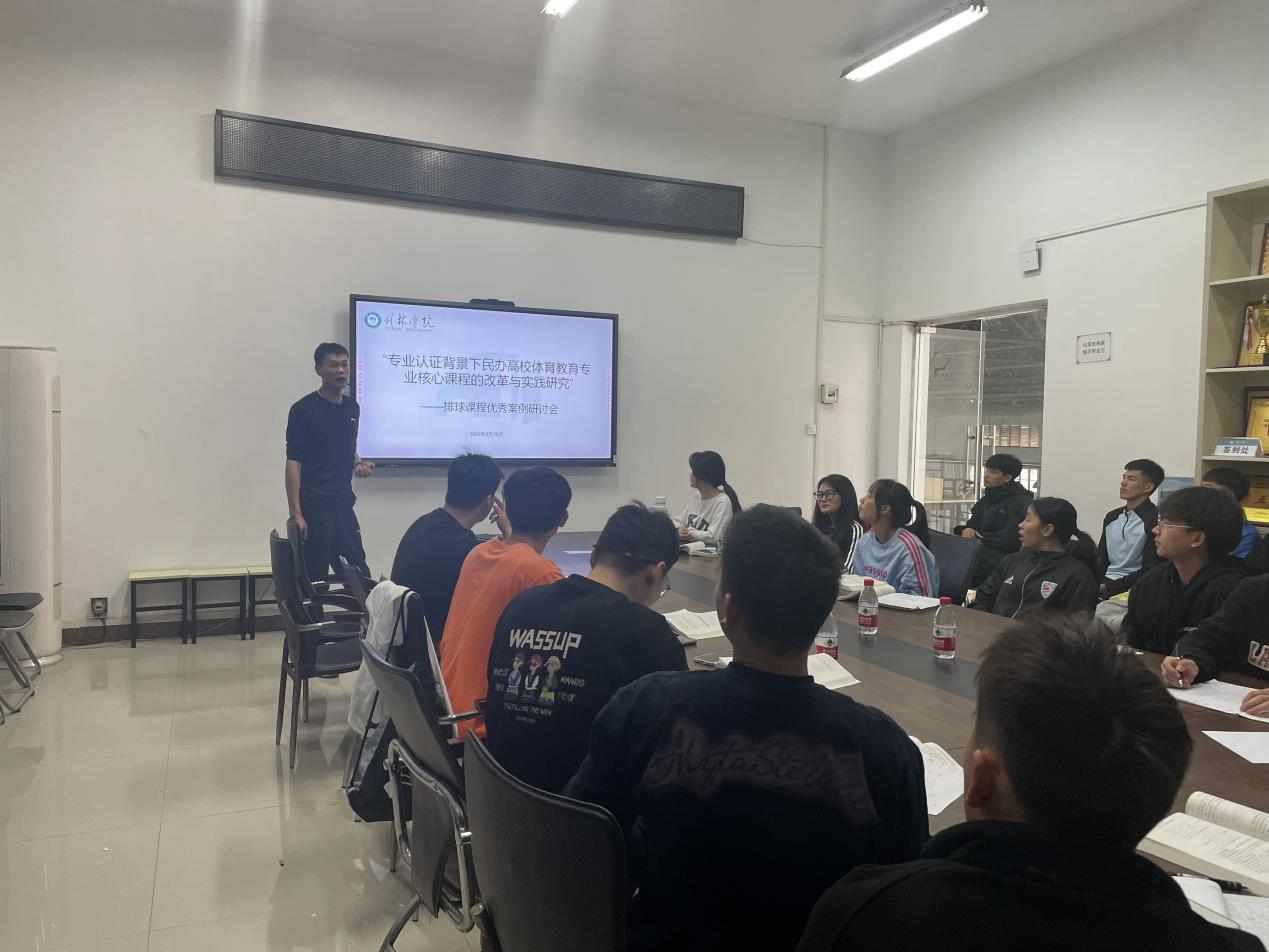 3月15日上午,“专业认证背景下民办高校体育专业核心课程的改革与实践研究”课题组于彰善楼4楼开展“排球课程优秀教学案例”研讨会。此次研讨会课题负责人李毅组织了2021级排球专选班的全体学生参与研讨,并邀请了李善华教授莅临现场指导。