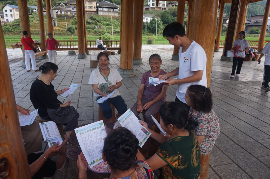 到达江口村后,当地村委向师生团队介绍了江口村情况。在了解基本情况后,志愿者们向村民分发了健康宣传单,宣传单内容涵盖了老年人常见疾病的预防、合理饮食、科学锻炼等方面的知识,旨在提高村民的健康意识。