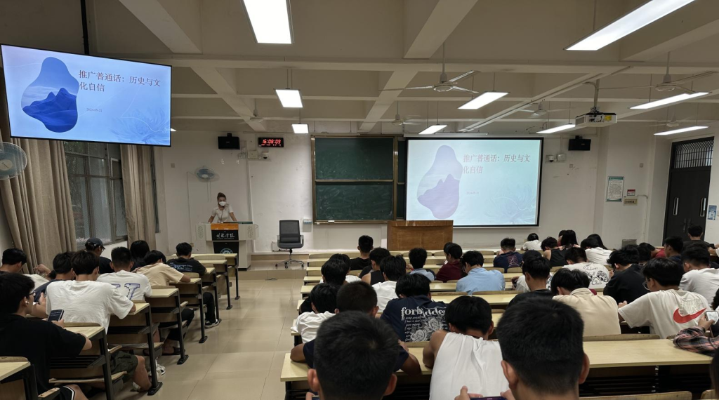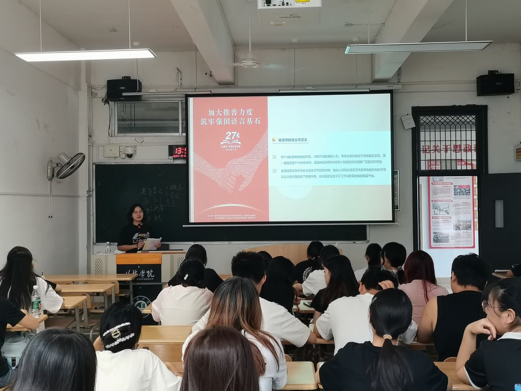 9月22日,体育与健康学院各年级开展了“加大推普力度,筑牢强国语言基石”主题晚例会,主题例会由各专业辅导员主持,全体在校生参加了主题班会。