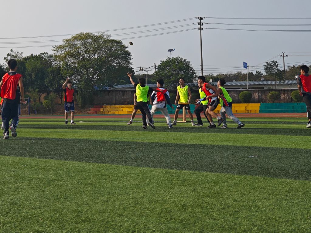 运动会在热烈的掌声和欢呼声中拉开序幕。随着铿锵有力的鼓点,舞狮表演首先登场,4头威武的狮子也在场上跳跃、翻滚,展现了运动员们的高超技艺,赢得了现场观众的阵阵喝彩。随着悠扬的音乐响起,太极扇的表演者们身着飘逸的白色服装,手持色彩斑斓的扇子起舞,每一个转身、每一个挥扇都透露出太极的刚柔并济之美。在绿茵场上,运动员们分成两队,围绕一个象征胜利的花炮展开争夺,他们敏捷地穿梭在场上,每一次跳跃、每一次扑救都充满了力量与速度的较量,现场的气氛也达到了高潮。