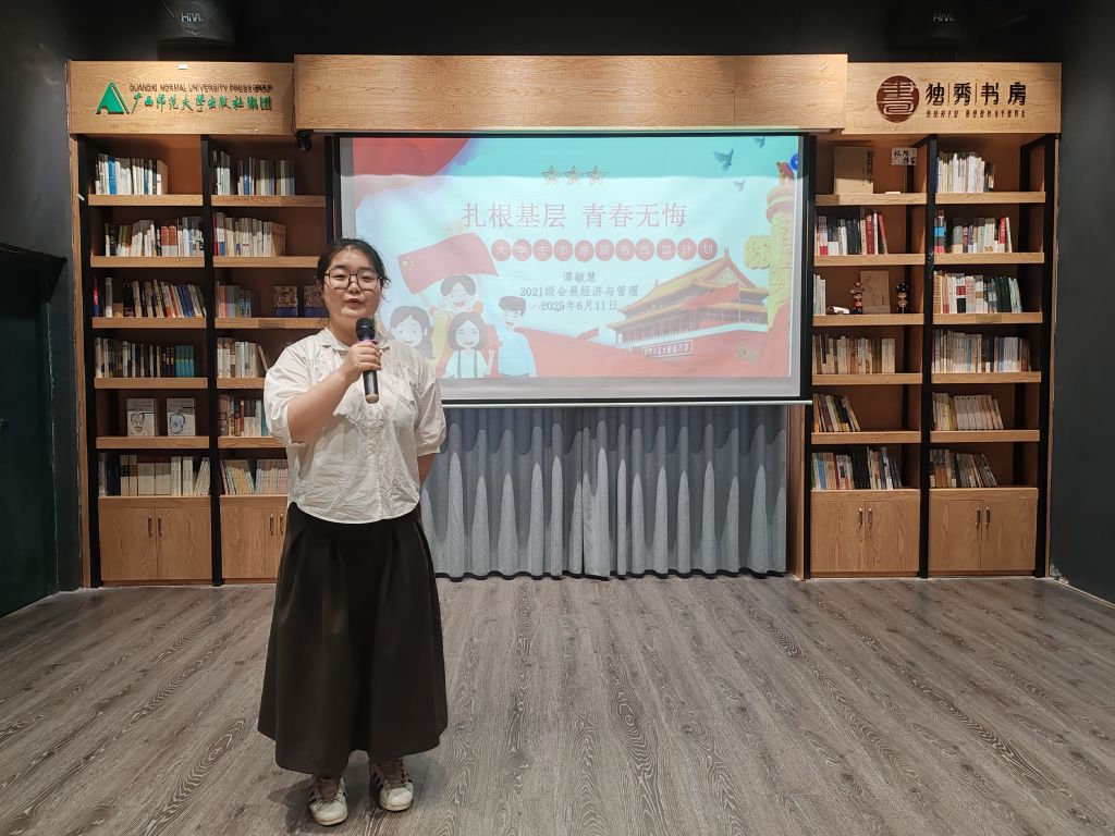 图:谭敏慧同学以“扎根基层,青春无悔”为主题进行分享交流