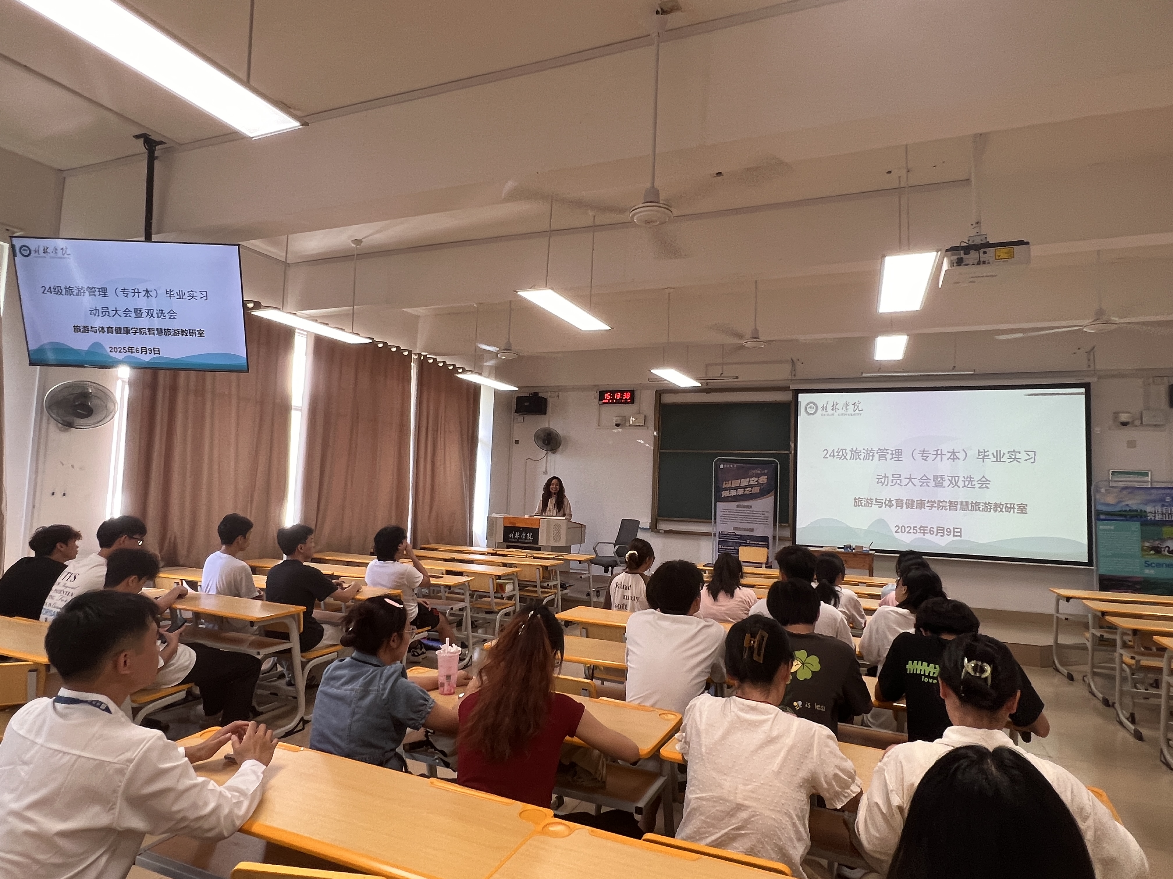 6月9日,旅游与体育健康学院在1414教室召开毕业实习动员大会暨实习双选会,2024级旅游管理专升本专业学生参加活动,桂林信昌集团代表应邀出席,活动由康养旅游教研室副主任刘小玲主持。