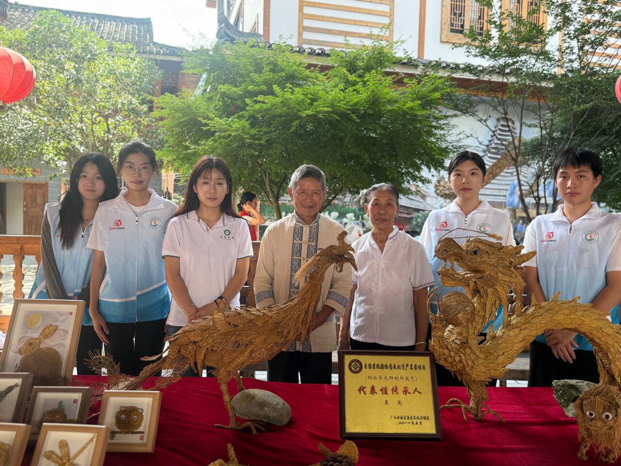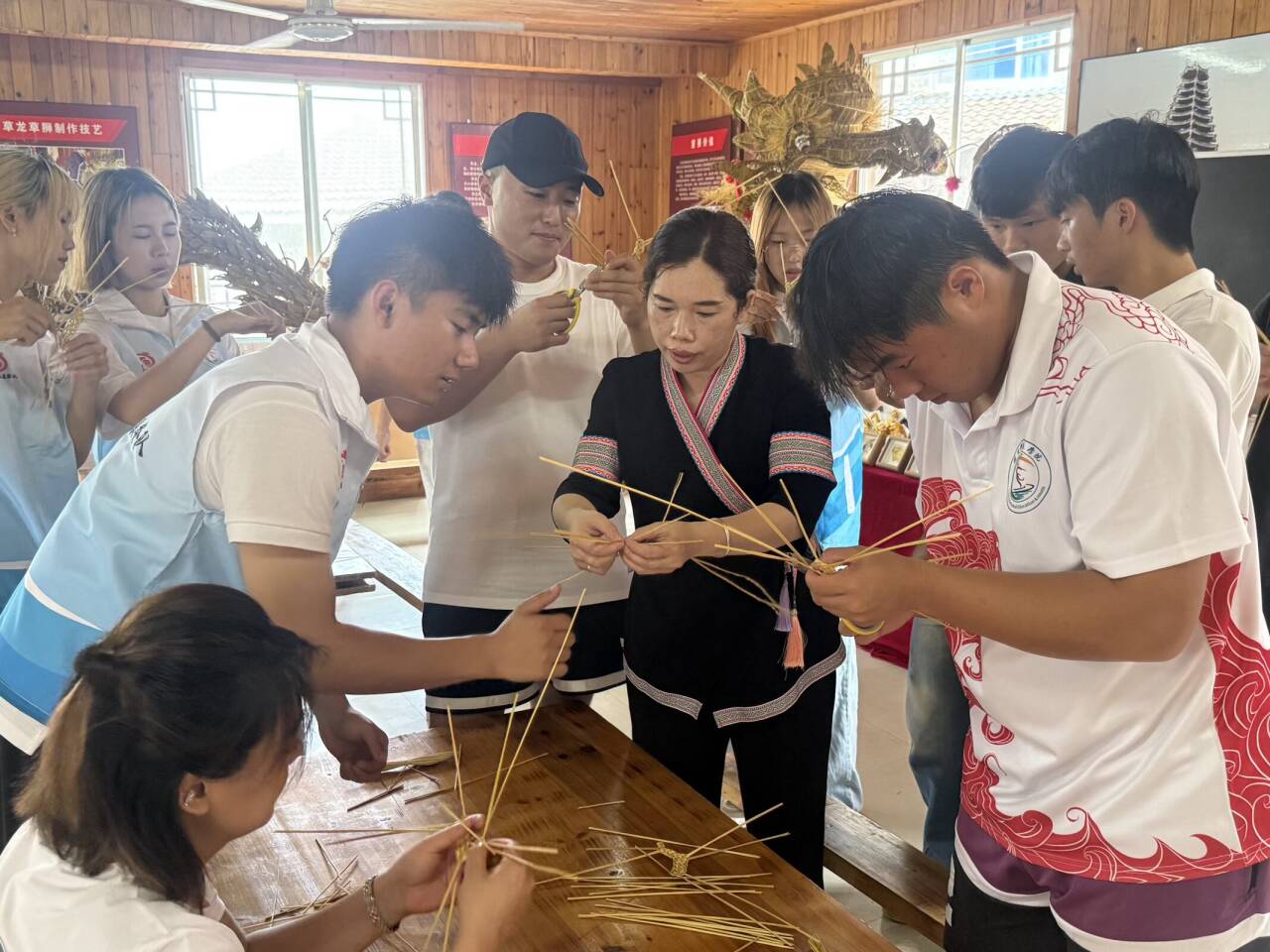 据《广南村志》记载,草龙制作始于清朝嘉庆年间,最初是侗族先民为驱虫祈福而扎制的“草把龙”,后于2010年入选广西壮族自治区级非物质文化遗产名录。在村委会副主任蒙春苗的带领下,实践团成员走进侗族草龙草狮学习基地。当地资深草编艺人手持金黄色糯禾秆,向同学们示范龙鳞编织技艺,同学们在艺人指导下,尝试用编辫法、编席法等传统工艺制作龙鳞片。据了解,每片龙鳞需编织上百根禾杆,一条完整的15米草龙需耗用60多公斤优质糯禾杆,耗费200多个工日。省级非遗传承人王禹向实践团展示珍藏的草龙作品时表示,目前全村掌握全套制作技艺的匠人已不足十人。面对传承困境,实践团积极建言献策,计划通过制作宣传视频、撰写深度报道等方式扩大非遗草龙的影响力,并结合专业特色探索“非遗 + 体育旅游”的融合发展模式。活动尾声,师生们与非遗传承人王禹在草龙和草编文创作品前合影留念。