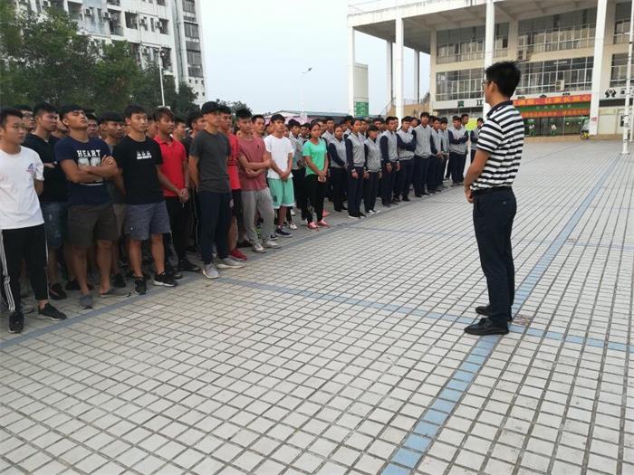 10月9日,开学第六周星期一早晨,现已是中秋节过后,天气已经开始逐渐的转冷,体育系全体同学与老师在食堂广场举行本学期第一次升旗仪式。参加升旗仪式的老师有付健老师和李炎老师。