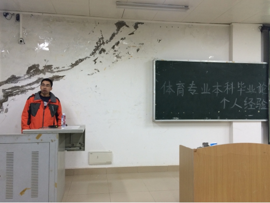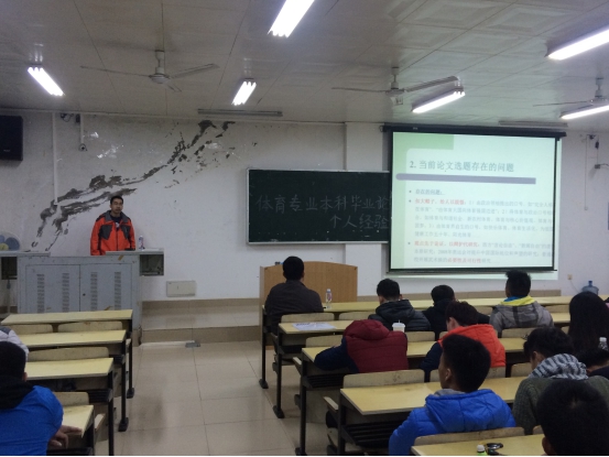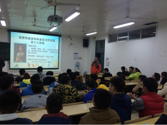 2015年12月2日晚上7:30在1411教室,杨海晨教授给我系2012、2013级全体学生做了关于《体育专业的毕业论文选题及个人经验》的专题讲座。杨海晨教授是华中科技大学博士后、桂林电子科技大学教师、广西师范大学硕士生导师。他通过分享个人成长经历、求学经历以及科研成果,用通俗易懂的语言阐述了体育专业的毕业论文究竟如何选择合适的论文题目,他认为,体育专业的毕业论文选题应当与当前的社会现状相结合,扩大选题的范围,不拘泥于体育本身。讲座历时1个半小时,现场互动颇多,气氛活跃,效果明显。通过此次讲座,同学们收获很多,并表示对于马上就要开始的毕业论文选题很有信心,也期待举行更多有益于学生学习成长的专题讲座。