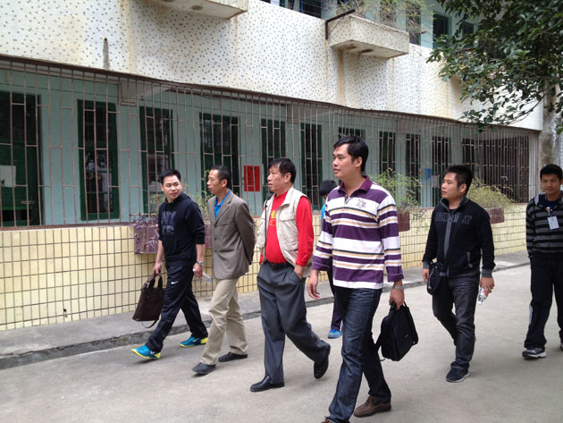 临桂一中唐副校长(左二)带领我系检查组参观学生上课场地