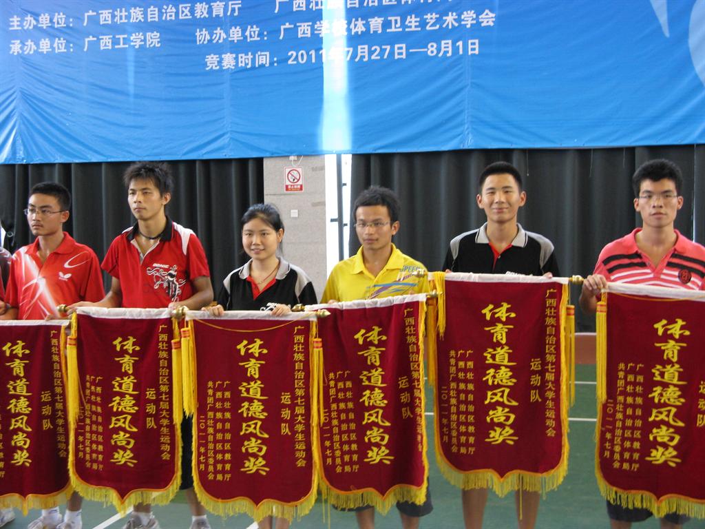 比赛过程中,漓院代表队始终牢记“友谊第一、比赛第二”的体育宗旨,文明比赛,赛出风格,很好的发扬了体育竞技赛场上的顽强拼搏精神以及集体主义精神,获得了在场裁判员和各代表队领队的一致好评及肯定。最终,在参赛的44所高校的共同投票评选下,广西师范大学漓江学院乒乓球男子代表队和女子代表队同时获得了主委会颁发的“体育道德风尚奖”运动队荣誉称号。