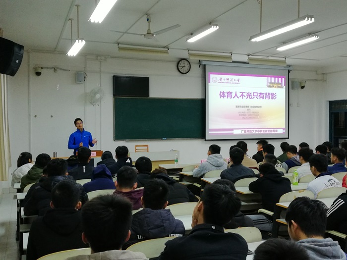 为积极引导我系2018届毕业生了解就业和创业信息,提高就业和创业能力,12月3日体育系在广西师范大学文一区508教室开展了以“拓宽就业渠道,提高创业意识”为主题的专题讲座,讲座由广西师范大学学生管理科科长、国家职业指导师蔡兵老师主讲,我系党支部书记付健、毕业班辅导员以及全体2018届毕业生聆听了讲座。