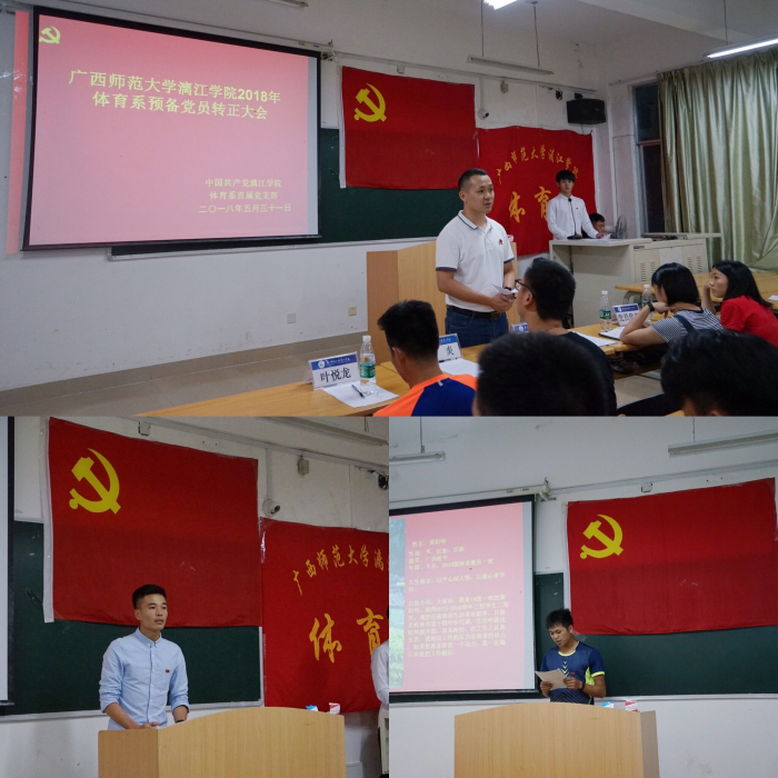2018年5月31日晚,体育系直属党支部学生党小组在1208教室召开预备党员转正大会,体育系学生党小组组长陈海斌老师、副组长李炎老师、教师代表叶悦龙老师全体党员和入党积极分子参加了会议。