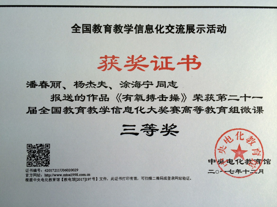 为提高我系教师的教育技术应用水平,丰富教学内容,推进体育教育教学改革,根据教育厅《关于组织参加第二十一届全国教育教学信息化大奖赛的通知》(桂教办〔2016〕1004号)文件精神,我系积极组织遴选、推荐优秀作品参加大赛。近日传来喜讯,我系教师取得三等奖2项的优异成绩。