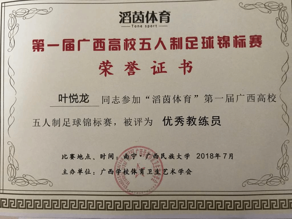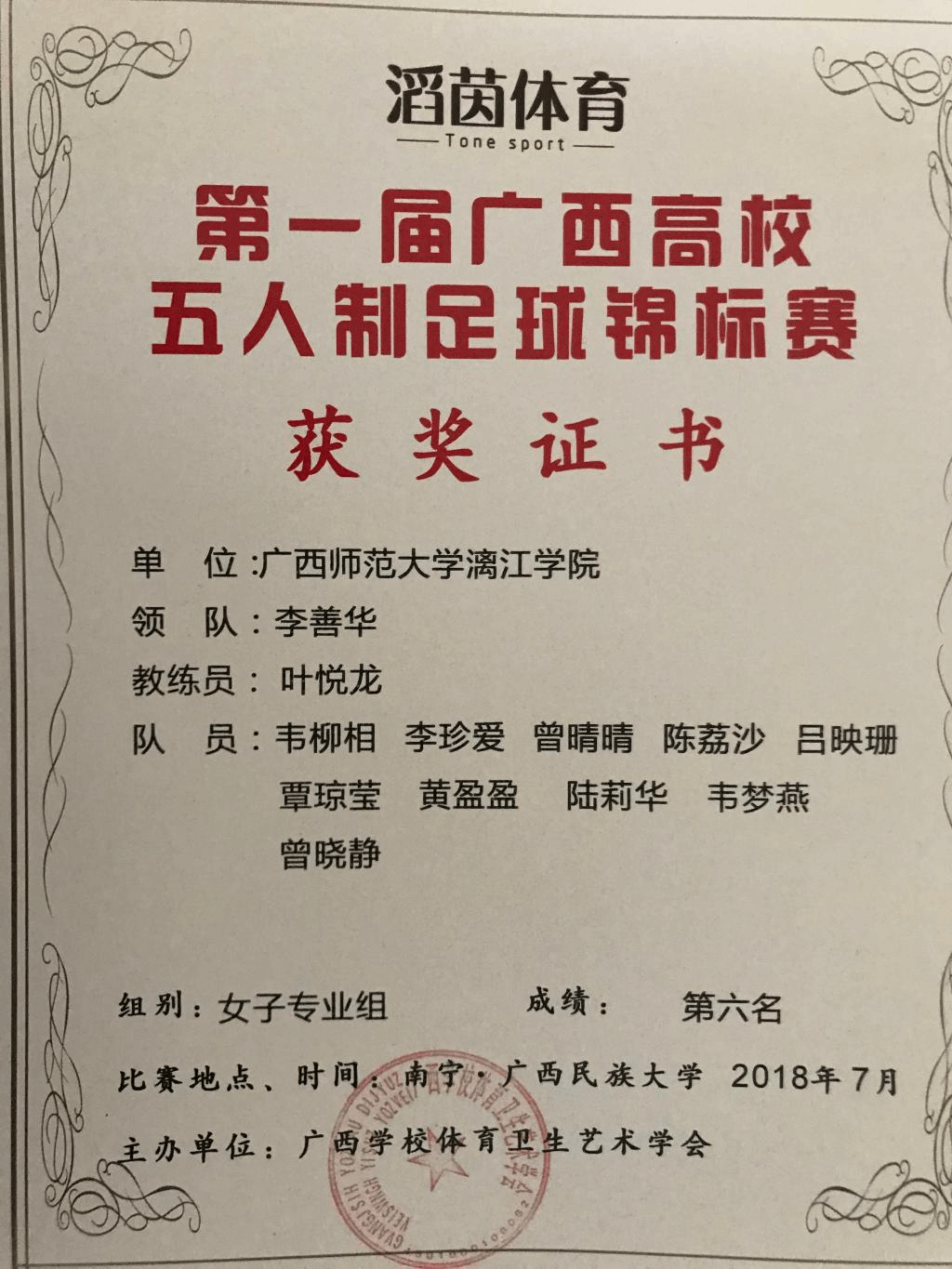 7月16日至21日,由广西学校体育卫生艺术学会主办的第一届广西高校五人制足球锦标赛在广西民族大学举行。大赛共分六个组别,来自全区的46支高校足球队捉对角逐,历经6个比赛日的激烈争夺,最终我校女子足球队获得专业组第六名的好成绩,叶悦龙老师获得优秀教练员称号。