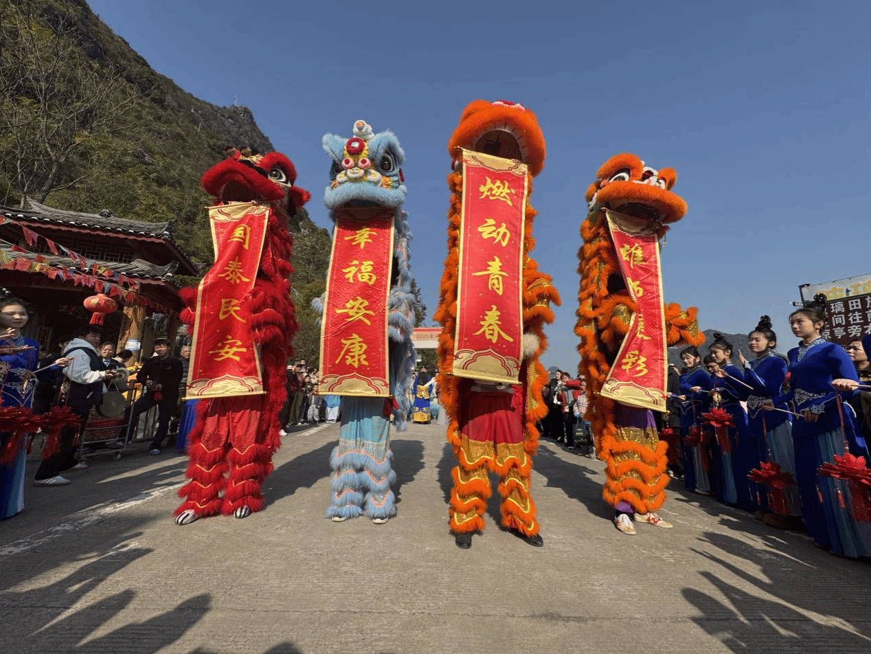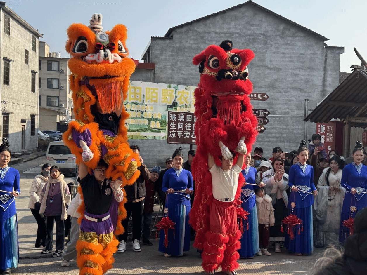 活动现场,伴随着铿锵有力的传统锣鼓点,桂林学院龙狮队的队员们身着鲜艳夺目的表演服饰,精神抖擞。他们手中的狮子时而昂首盘旋,威猛霸气;时而灵动跳跃,憨态可掬。在冬日暖阳的照耀下,队员们以精湛的技艺、默契的配合,将传统舞狮文化的威武雄壮与吉祥灵动展现得淋漓尽致。激昂的鼓点响彻会仙镇,精彩的表演吸引了众多村民与游客驻足观看,掌声与喝彩声不绝于耳,点燃了全场热情。