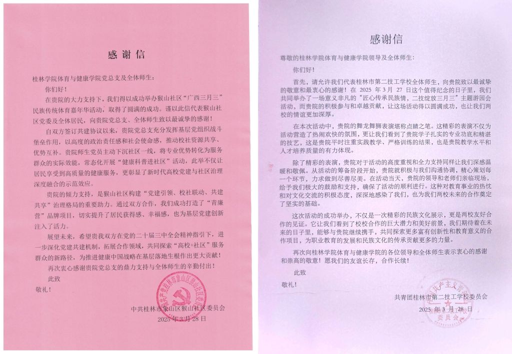 图:猴山社区、桂林市第二技工学校向桂林学院体育与健康学院发来感谢信