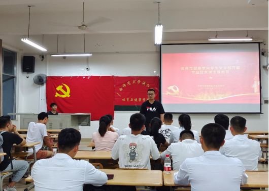 为加强毕业生党员教育,强化党员意识,引导和激励广大毕业生党员坚定理想信念,以饱满的热情走向新的学习和工作岗位。6月17日晚,体育与健康学院学生党支部于至善楼1311教室开展毕业班离校前“最后一次党课”活动,体育与健康学院学生党支部全体成员,学生党支部副书记李炎参与了本次活动。