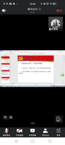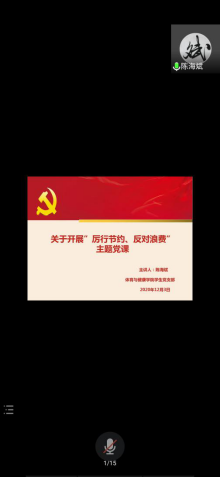 12月3日,体育与健康学院学生党支部在线上腾讯会议开展“厉行节约、反对浪费”主题党课,全体学生党员和预备党员参加本次党课,由陈海斌老师主持学习。