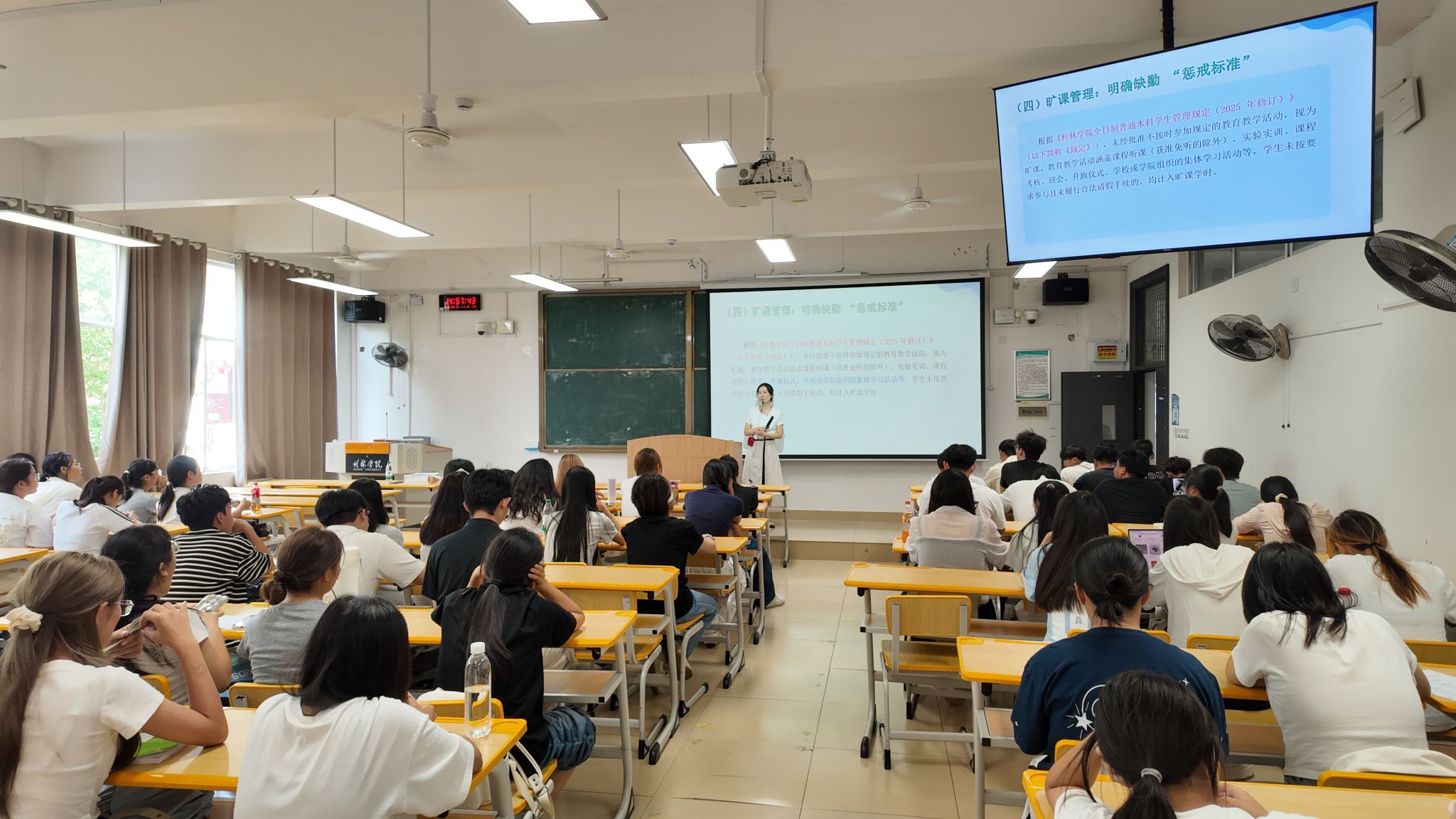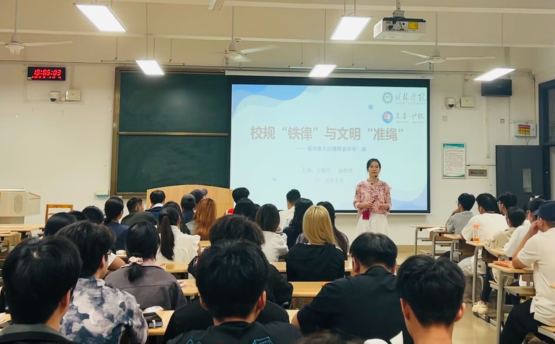 10月9日—10月22日,旅游与体育健康学院集中组织全体 2025 级新生开展“校规‘铁律’与文明‘准绳’—— 旅体新生的规则素养第一课”系列教育活动。辅导员王海玲老师担任主讲,以专题授课、案例研讨为主要形式,系统解读校规校纪核心内容与文明行为规范,为新生平稳适应大学生活、树立专业职业素养筑牢基础。