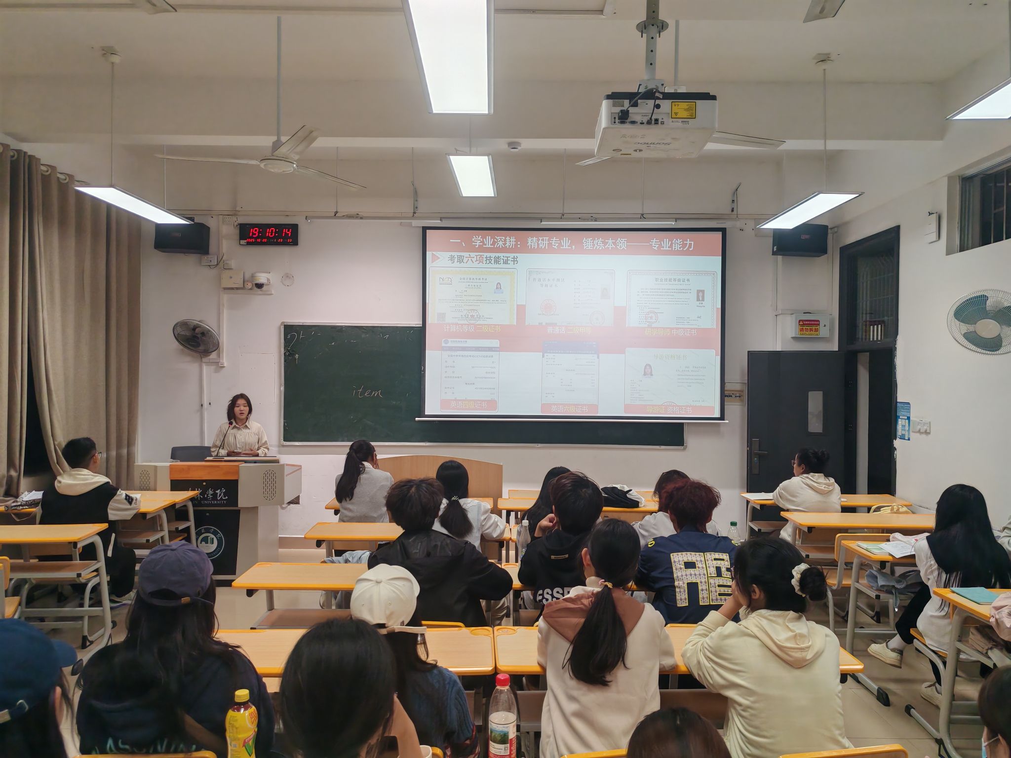 在随后的互动交流环节,2025级新生们踊跃提问,问题涉及课程学习、考证规划、实习准备以及如何应对学业压力等多个方面。王馨与屈梦可两位同学对学弟学妹们的困惑给予了耐心、细致的解答,她们的回答贴合实际,赢得了在场同学的阵阵掌声。