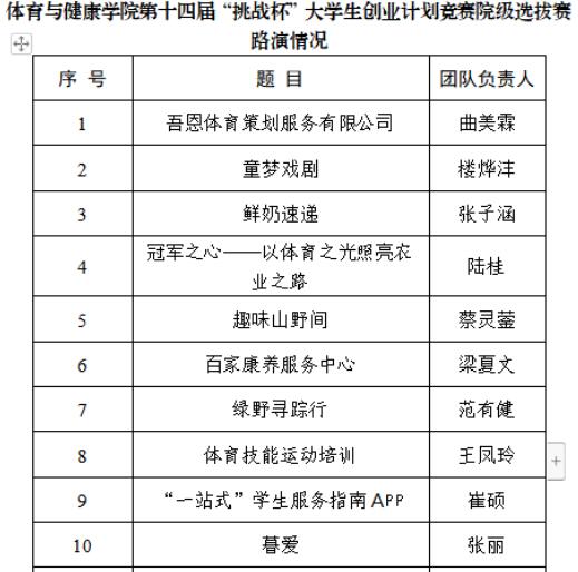 4月22日,体育与健康学院于彰善楼四楼会议室举办了第十四届“挑战杯”中国大学生创业计划竞赛院级选拔赛,本次比赛由体育与健康学院党总支书记郭时骏、副书记许承婷,团总支书记唐雪雁、副书记远亚婕,专任教师赵铂川担任评委,共有16支队伍参加路演。