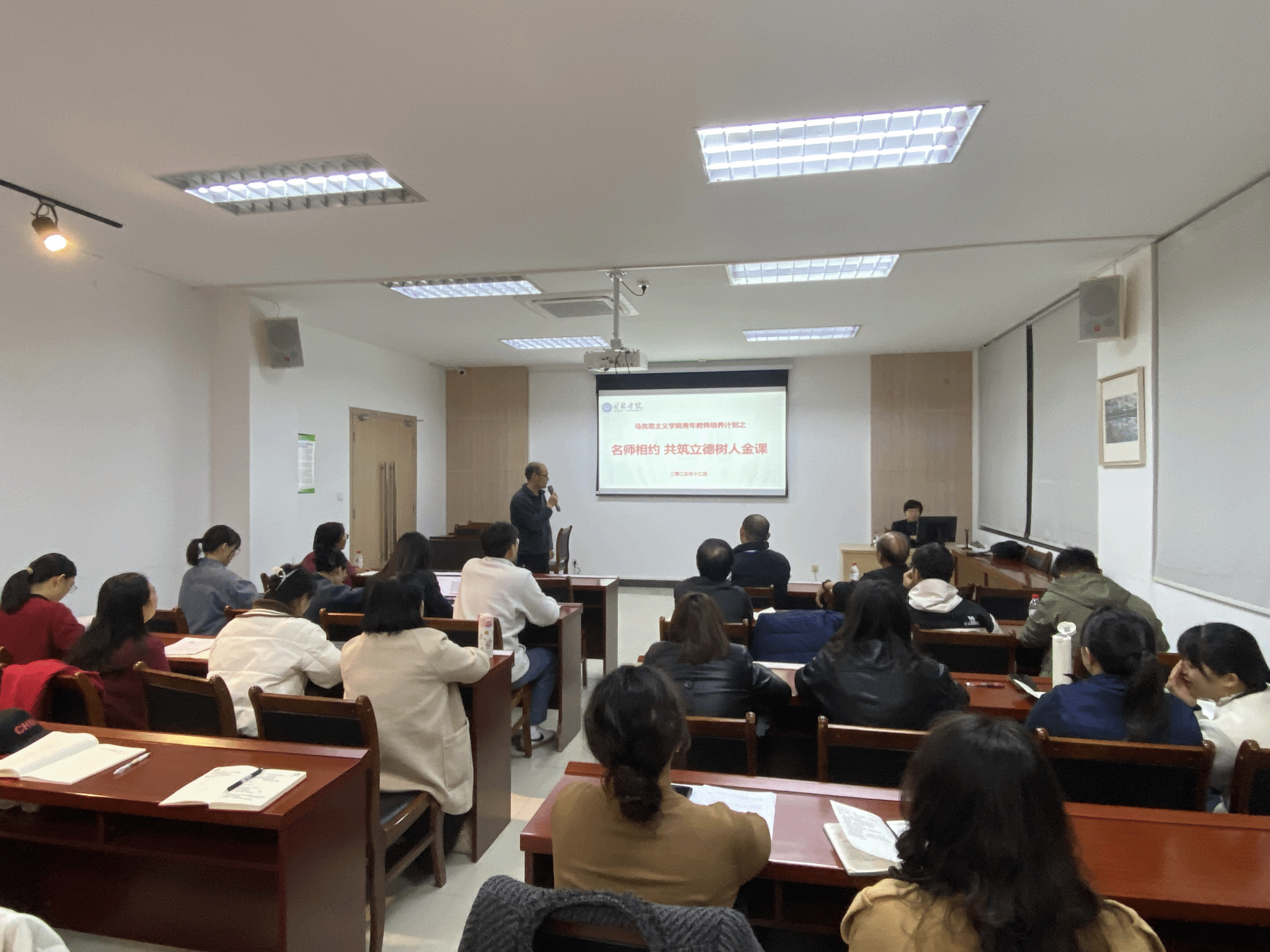 梁英教授从“新时代办好高校思政课的重大意义”“何为‘高精尖’的高校思政金课”“当前高校思政课建设的痛点难点堵点”“打造高校思政课‘金课’的探索与实践”四方面展开。讲座过程中,梁教授的讲解深入浅出、旁征博引,既有理论高度,又有实践指导意义,现场气氛热烈,互动频繁。参会教师认真聆听、详细记录。