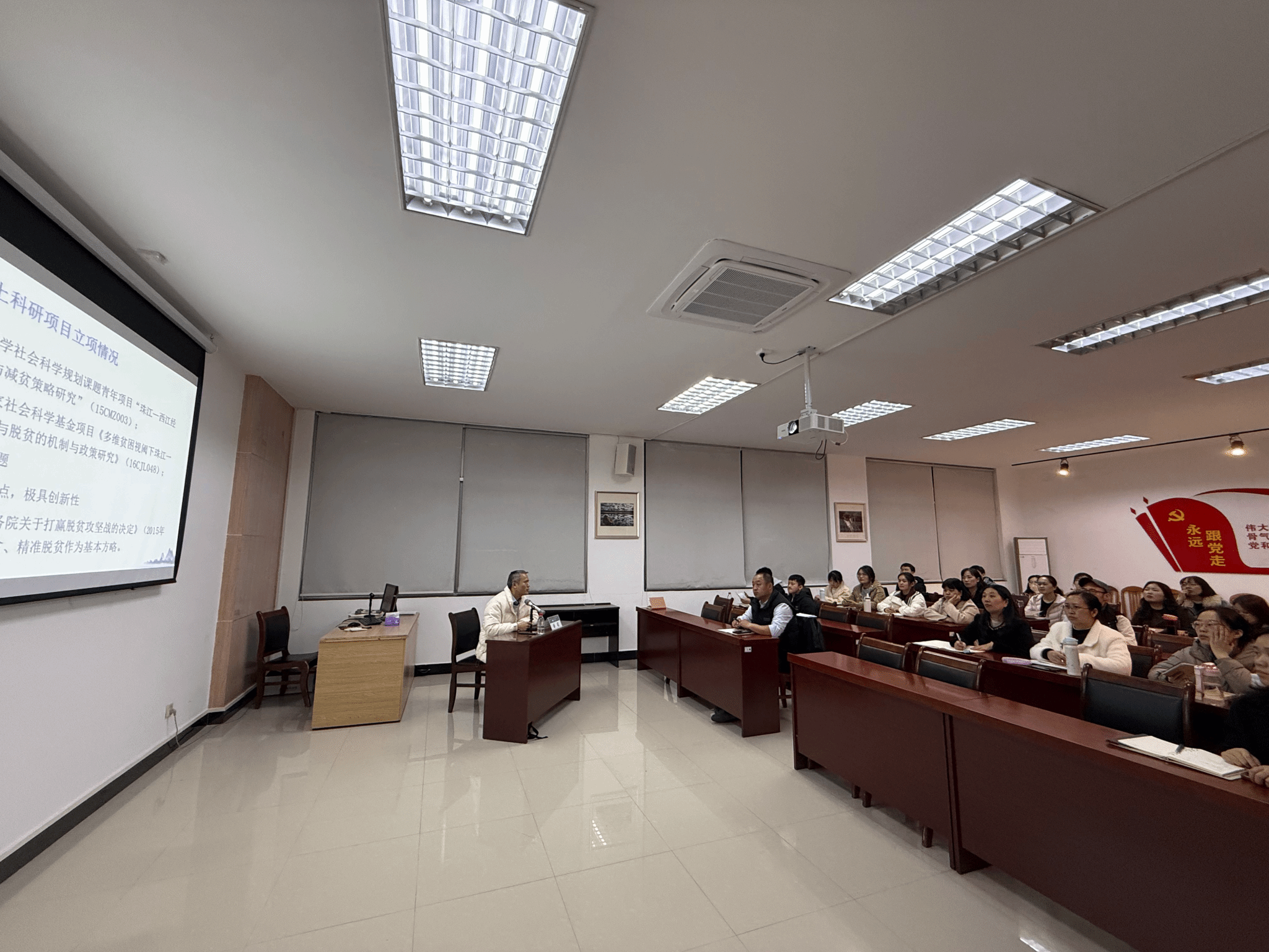 12月16日,马克思主义学院特邀广西师范大学马克思主义学院廉超教授开展题为“社科基金项目申报经验交流”的专题讲座。讲座由学院院长主持,学院思政课教师参会,现场学习氛围浓厚。