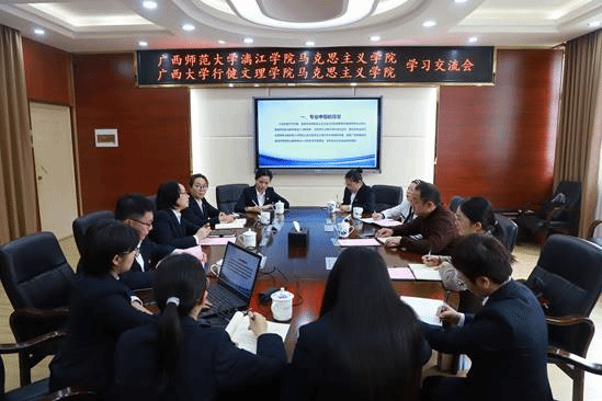 为加强兄弟院校间的交流,互相学习,共同提高,3月12日,马克思主义学院院长张常永、副院长吴秋燕和曾云莺副教授一行三人赴广西大学行健文理学院马克思主义学院考察交流,交流会由广西大学行健文理学院马克思主义学院常务副院长刘希岩主持,广西大学行健文理学院副校长、马克思主义学院院长陈洪涛教授出席并发言,广西大学行健文理学院马克思主义学院副院长马东和各教研室主任参会。