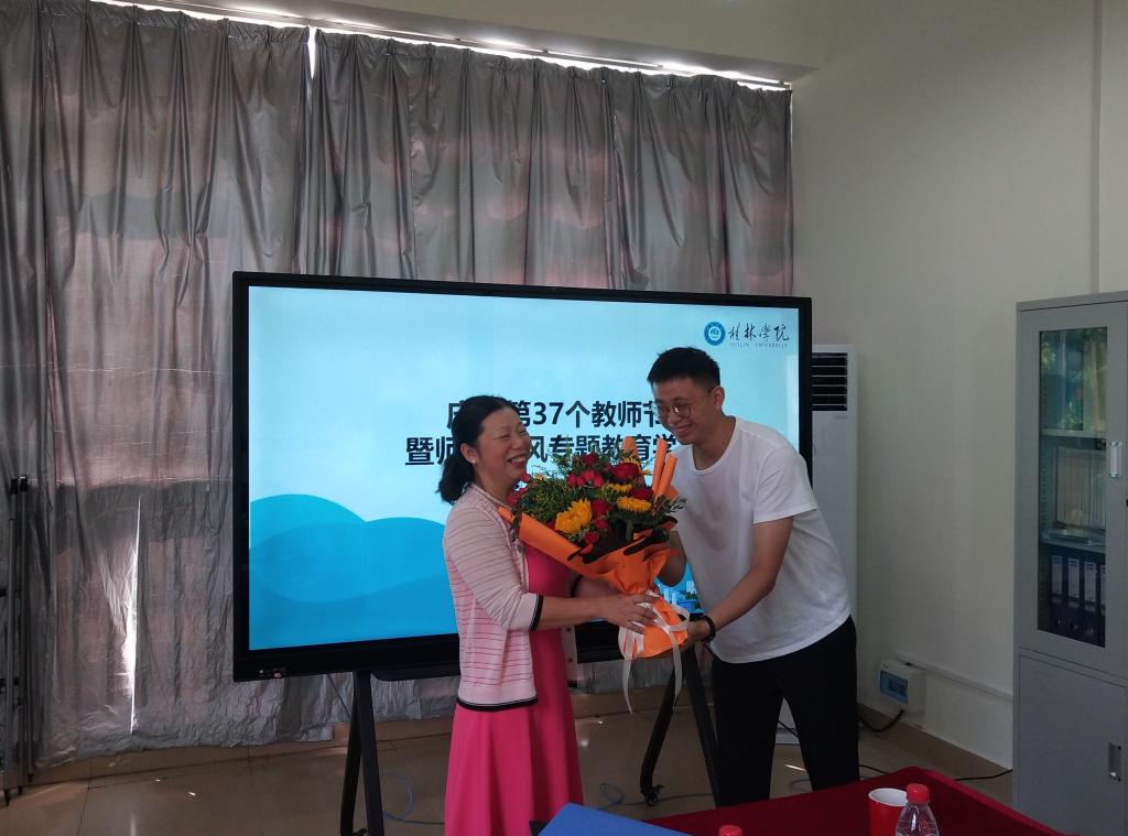 在活动开始,张常永院长向全体教师表示节日的问候和祝福,并由青年教师李延和刘莹分别向老教师代表曾云莺副教授、李会平副教授送上节日祝福。随后,副院长、党支部书记吴秋燕以“赓续百年初心,担当育人使命”为主题带领全体教职工回顾了党的十八大以来习近平总书记关于教育的重要论述,鼓励全院教师以习近平新时代中国特色社会主义思想为指引,砥砺前行,再接再厉,以先进典型为榜样,要进一步加强教师队伍建设,自觉在为党育人、为国育才新征程中实现新作为、再创新辉煌。