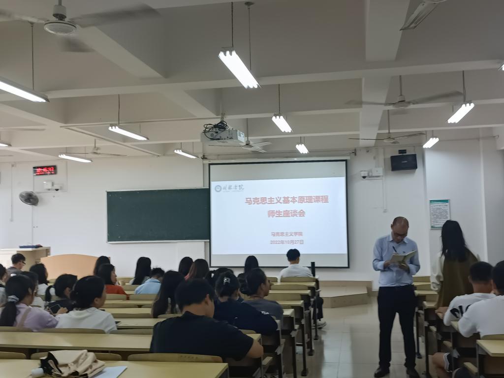 为进一步了解“原理”课程教学情况,提升课程教学质量,促进思政课教学改革,10月27日中午,在至善楼1307教室,马克思主义基本原理教研室组织召开师生座谈会。座谈会由教研室主任马俊涛主持,2021级本科专业和2022级专升本同学代表参加了座谈会。