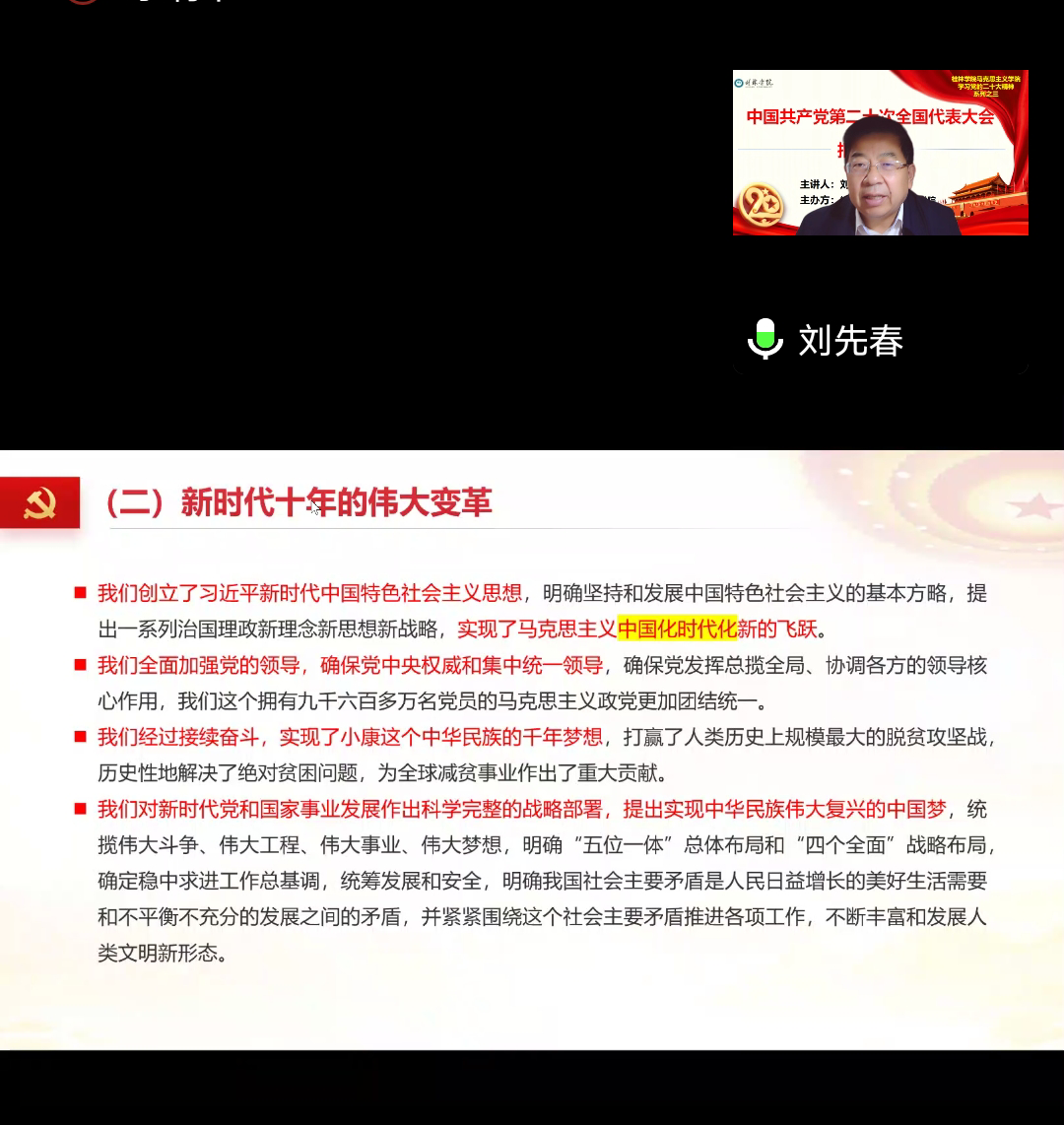 刘先春教授分别就中国共产党第二十次全国代表大会主题、“三个务必”、新时代十年的伟大变革、开辟马克思主义中国化时代化新境界、新时代新征程中国共产党的使命任务、加快构建新发展格局,着力推动高质量发展、实施科教兴国战略,强化现代化建设人才支撑、发展全过程人民民主,保障人民当家作主、坚持全面依法治国,推进法治中国建设、推进文化自信自强,铸就社会主义文化新辉煌、增进民生福祉,提高人民生活品质、推动绿色发展,促进人与自然和谐共生等内容进行了理论解读。随后,马克思主义学院师生代表与刘先春教授就党在新时代的中心任务、马克思主义中国化时代化、中国式现代化等内容进行了深入交流。