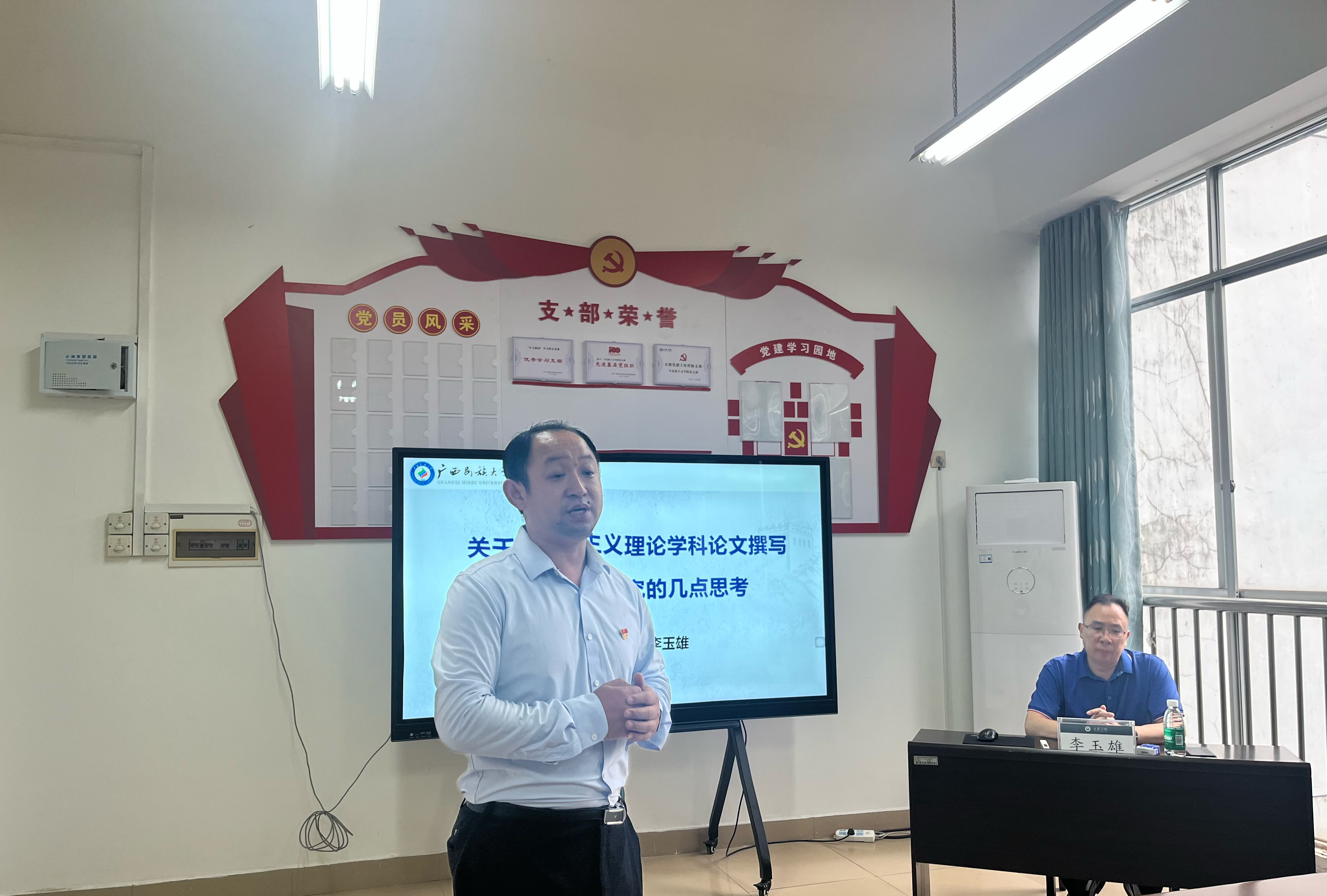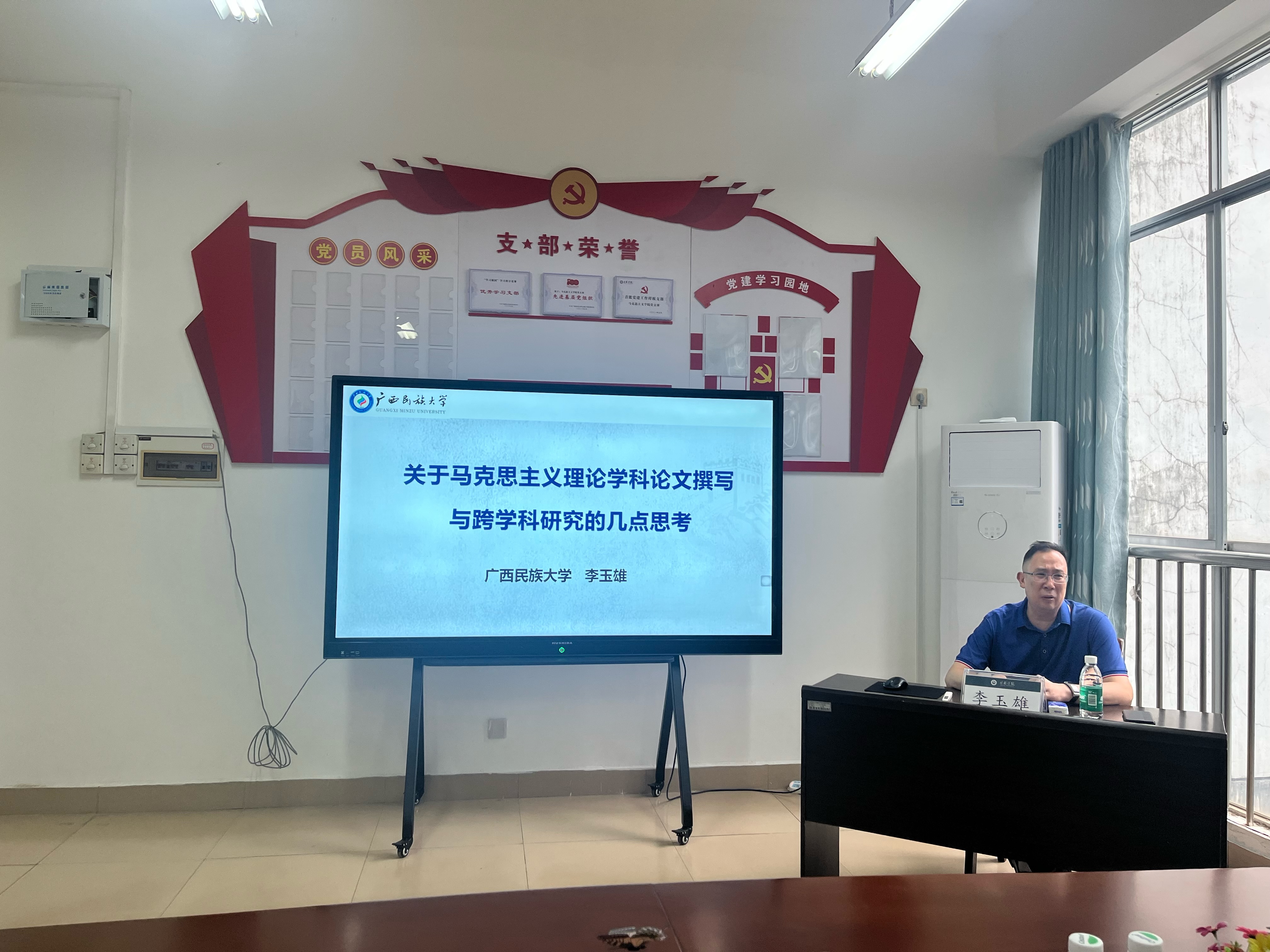 10月27日,应马克思主义学院邀请,广西民族大学马克思主义学院院长、博士生导师李玉雄教授在学院会议室作“关于马克思主义理论学科论文撰写与跨学科研究的几点思考”专题讲座,讲座由我院院长张常永主持,学院思政课教师到场聆听。