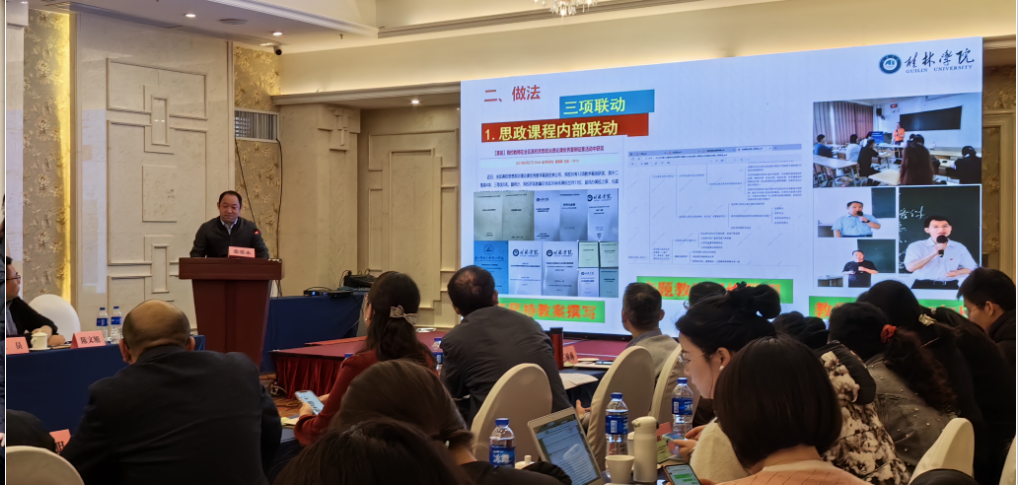 研讨会第二阶段,来自区内广西大学,广西师范大学,广西医科大学,桂林电子科技大学,广西艺术学院,桂林理工大学,广西民族大学,桂林学院等高校专家学者,结合所在高校思政课建设与改革成果,就如何进一步贯彻党的教育方针、高质量办好思政课、提高思政课教学实效、推动新时代高校思政课高质量发展、全面做好立德树人工作做了主题发言。我校马克思主义学院院长张常永以“民办院校‘三项联动+多维一体’思政课教学改革模式探索与实践”为题,介绍了我校思政课教学改革途径与实践成效,受到与会专家学者关注。