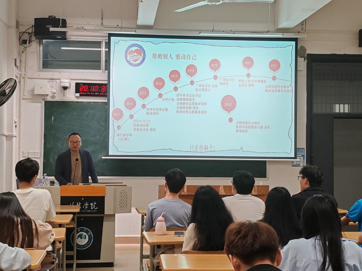 在讲座的最后,李老师以桂林助学联合会的志愿服务活动开展情况和取得的丰硕成果为例,展示了志愿服务在地方社区中的具体实践和成果,激励学习会成员们投身到志愿服务的行列中,用爱心和行动传递雷锋精神,为社会带来更多温暖与希望。此次讲座不仅加深了学习会成员对雷锋精神的理解,更激发了他们践行雷锋精神的热情,相信在李鹏鸣老师的启发下,他们将继续传承和弘扬雷锋精神,在社会的各个角落播撒爱的种子,共同营造更美好的明天。