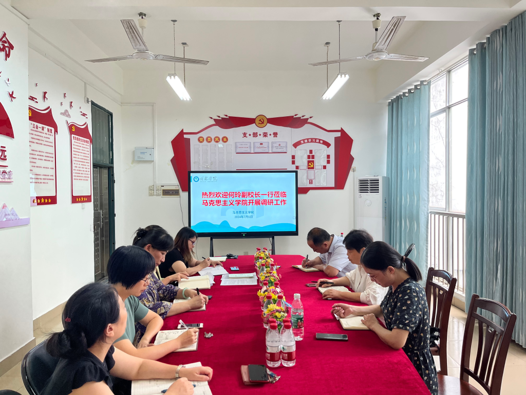 7月5日,何玲副校长到马克思主义学院进行调研并指导工作,张常永院长及教研室主任,教学秘书、行政秘书参会。