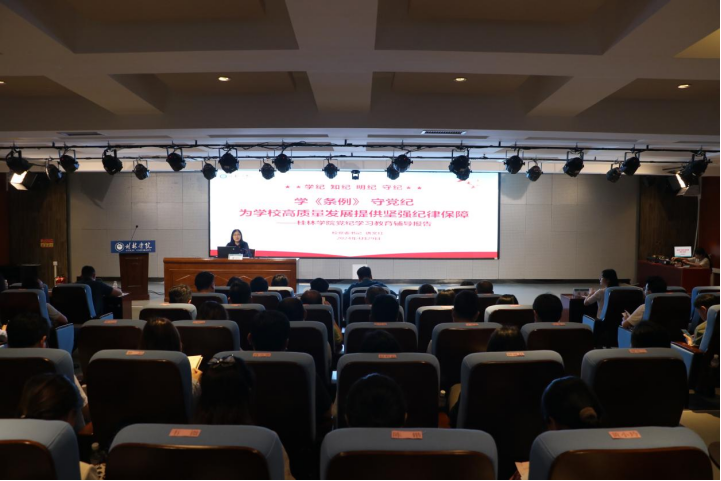 4月29日下午,学校党委书记唐文红在至善讲堂以《学〈条例〉 守党纪 为学校高质量发展提供坚强纪律保障》为题,为党员领导干部作专题讲座。学校全体在家校领导、全体中层管理干部到场聆听。