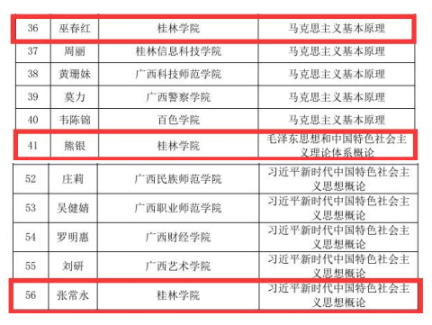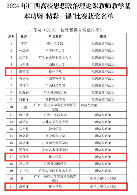 近日,2024年广西高校思想政治理论课教师教学基本功比赛暨“精彩一课”评选活动获奖名单公布,我校参赛的六门思政课教师代表张常永、阳建琼、吴秋燕、白爱萍、巫春红、熊银均获二等奖,实现了参赛人员、各门课程均获奖的新突破。