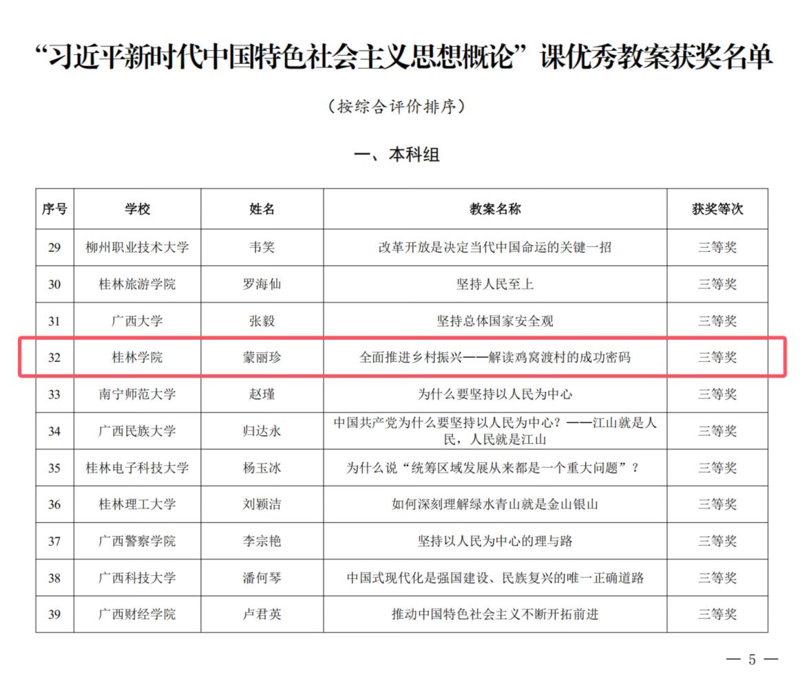 近日,自治区教育厅公布“习近平新时代中国特色社会主义思想概论”课优秀教学案例获奖名单,我校思政课教师蒙丽珍教案《全面推进乡村振兴——解读鸡窝渡村的成功密码》荣获三等奖。