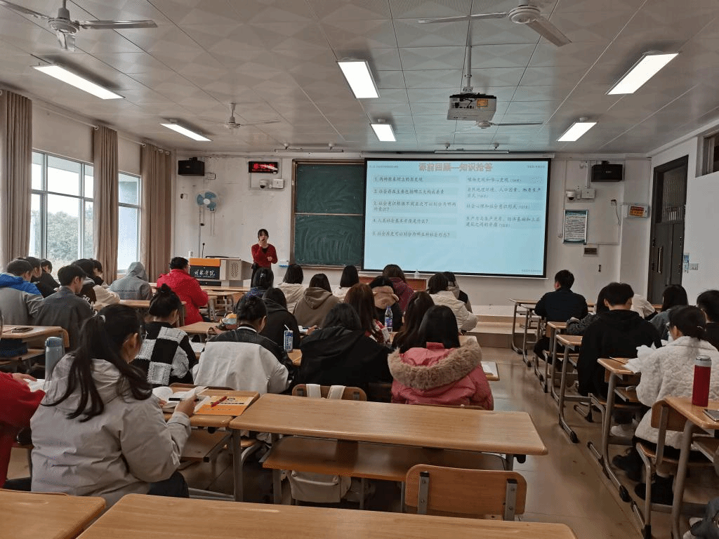 公开课上,蒙丽珍老师运用系统讲授法、案例教学法等教学方法,围绕社会基本矛盾、阶级斗争、改革、科学技术等方面内容,对社会历史发展的动力系统作了教学展示。在教学过程中,蒙丽珍老师紧扣教学目标,注重学生辩证思维的培养,特别是紧密结合学生实际,利用通俗易懂的教学案例,对社会基本矛盾、阶级斗争等学生难于理解的知识点作了深入浅出的分析,实现了知识传授、思政教育和价值引领的有机统一。