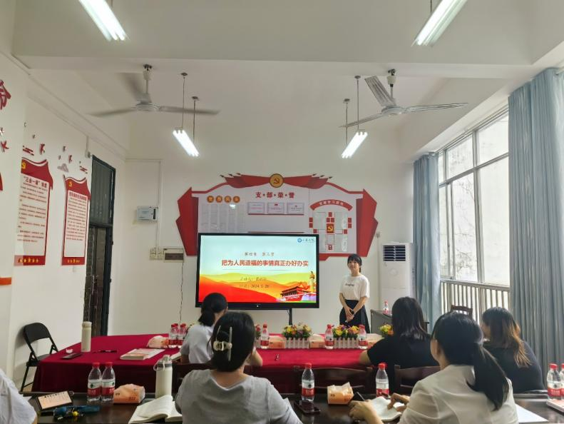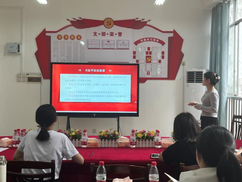 会议第二部分为集体备课。韩春兰老师领学了“全面依法治国”,阳建琼老师领学了“建设社会主义文化强国”。两位老师通过思维导图和多媒体课件,带领老师们从教材逻辑、教学重难点、教学方法等方面展开了深入的分析,进一步提升了教学的针对性。
