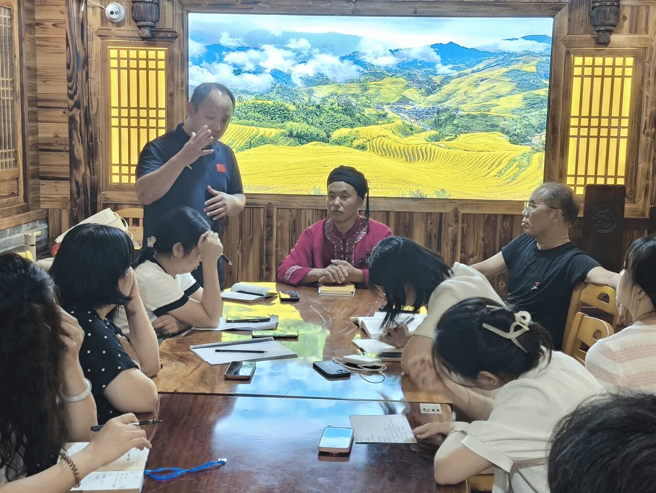活动中,团队首站来到龙脊镇大寨村,与村干部围绕《大寨大力发展“农文旅”一体化的历程及乡村基层党建治理》展开座谈。“种田就是种风景,种树就是种财源。”大寨村书记诠释了当地依托梯田景观发展文旅产业的实践逻辑,团队成员深刻感受到基层党组织在整合资源、引领产业转型中的核心作用。随后,团队聆听了全国民族团结进步先进个人潘保玉讲述的“少数民族团结奔小康”故事。从脱贫攻坚中的互助帮扶,到产业发展中的携手共进,潘保玉的讲述让团队成员深切体会到民族团结是乡村发展的重要基石。在白面瑶寨的泗水红军岩,团队成员聆听了“初心在此留”的红色故事,重温革命年代红军与瑶胞鱼水情深的历史,坚定了以党建引领服务地方的信念。研学期间,团队还走访了民合村,了解壮族、瑶族、汉族一家亲共同建设社会主义新农村的故事。