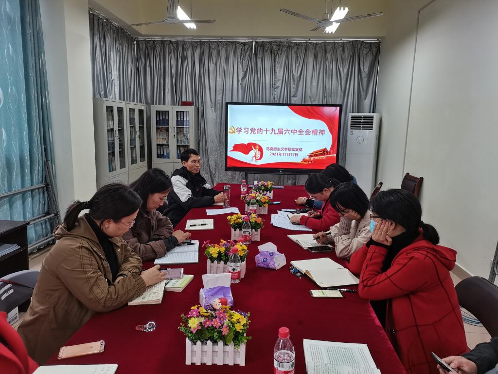 为更好地学习贯彻党的十九届六中全会精神,近日,马克思主义学院党支部在学院会议室举行党的十九届六中全会精神进课堂研讨活动,活动由学院副院长兼党支部书记吴秋燕主持,学院全体教师党员参加。