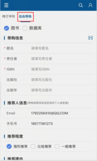 填写详细准确的书目荐购信息及推荐人信息,然后点击确认荐购。(题名(必填)、责任者(必填)、ISBN(必填) 、出版社、出版年、推荐理由)