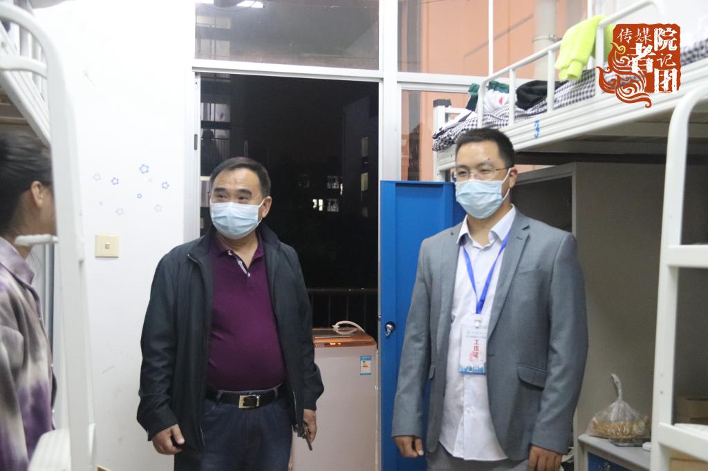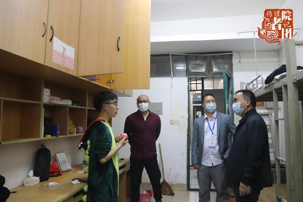 10月9日晚,传媒学院党总支书记孙俊、党总支副书记王德彬、2020新闻传播类辅导员曹依婷、2020播音与主持艺术和广播电视编导专业辅导员蒋承良、播音与主持艺术专任教师崔鸿林以及班助一同走访了新生宿舍。