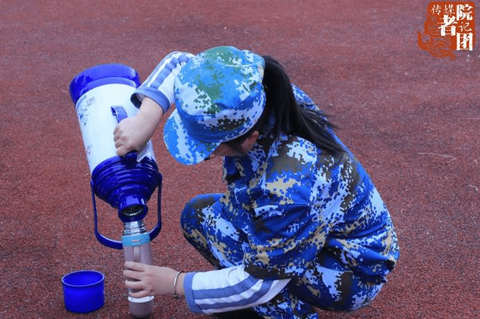 短暂的休息时间里,新生们争先恐后地喝水休息,喝完后又立马跑回自己的队伍里站好军姿等待教官训练。