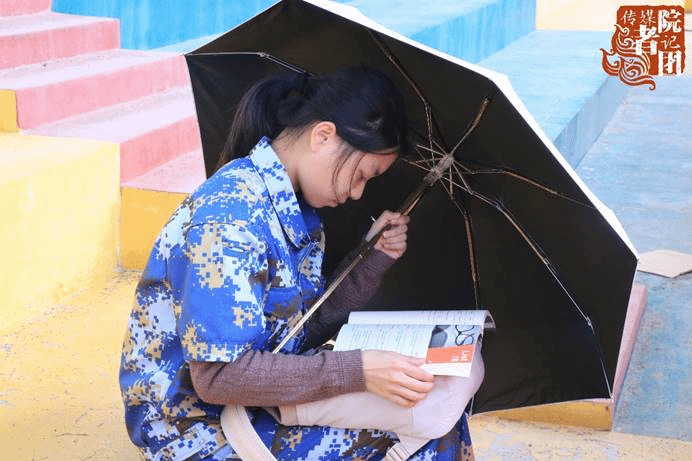 因腰伤无法完成训练的传媒学院新生顶着烈日在休息处读书