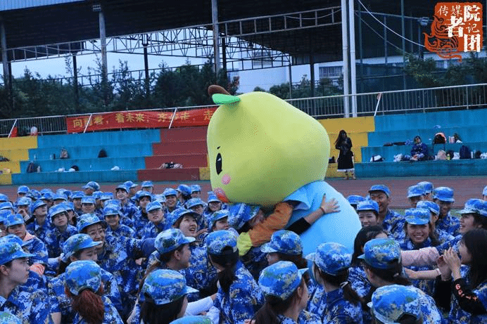 一整天的训练下来,传媒学院的同学们已经失去早晨的神采奕奕,但此时为社团宣传招新的吉祥物的到来,为他们洗去一整天的疲惫,脸上露出开心的笑容。
