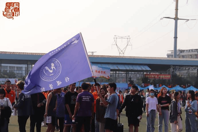 在闭幕式的特色项目跑旗中,传媒学院的代表扛着院旗一圈又一圈地绕着操场尽情奔跑,蓝色的传媒学院院旗,高高的扬在田径场的上空。在奔跑过程中,传媒学院全体师生都在加油、呐喊,为跑旗的同学鼓劲。